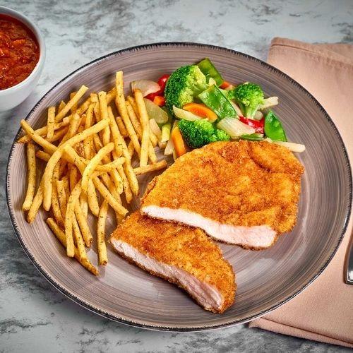 Milanesa de pollo crujiente por fuera y jugosa por dentro.